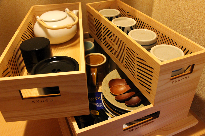 備品の益子焼湯呑みや急須などはローマ字で表記。外国からの観光客にとっても分かりやすいでしょうね!
