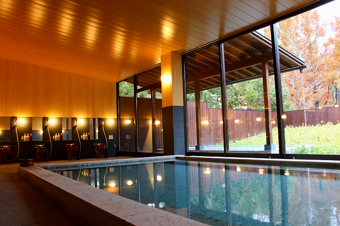 大浴場の露天風呂の先には紅葉に色づく彩り鮮やかな山々。