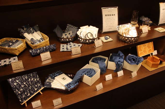 一階の売店でも「黒羽藍染」のお土産品を幅広く取り扱っているので、実際に手にとってみるも良し。