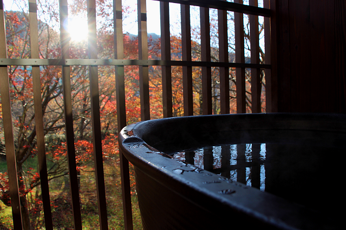 目の前にひろがる紅葉と露天風呂の光景だけでも感動なのに、直ぐに湯浴み出来ちゃうなんて...!
