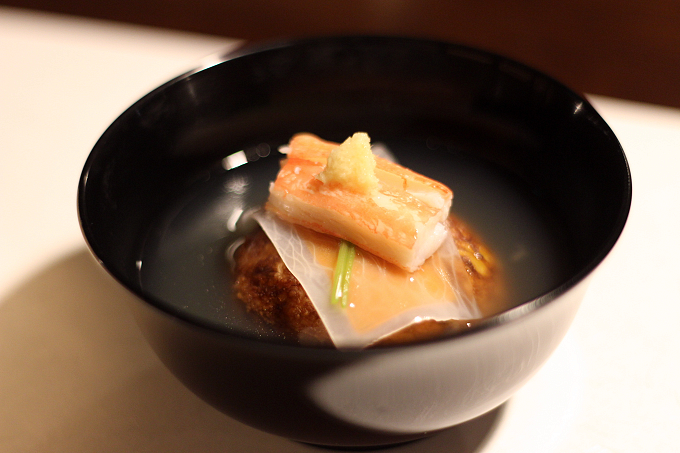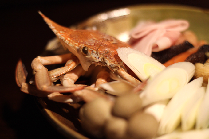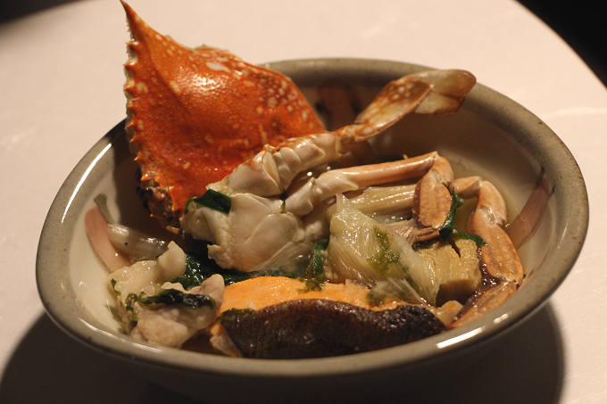 渡り蟹、かんぴょう、巻湯波などを、荒ぶる龍神のごとく、目の前でダイナミックに調理します。