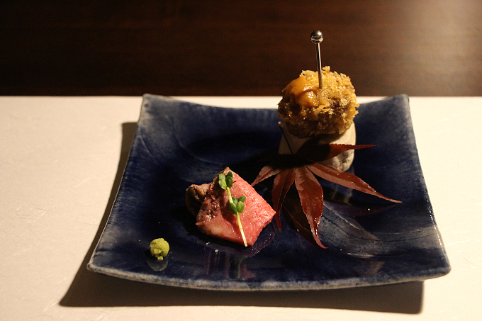 鬼怒川を表現した藍色の器に盛られた先付けには、牛肉を用いた2品。