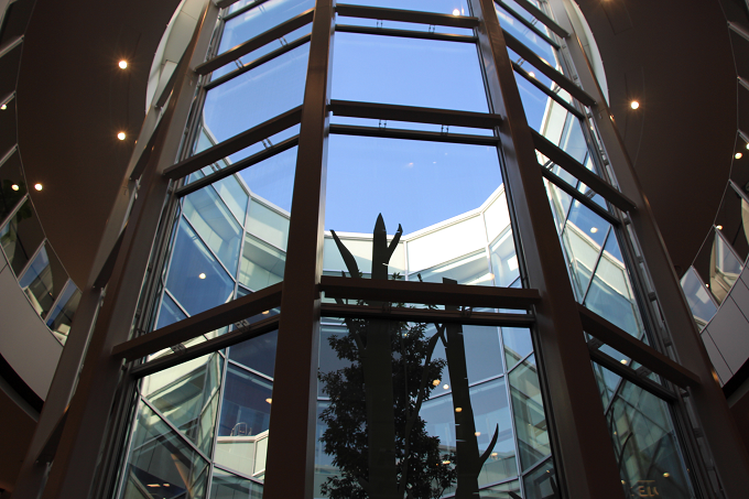 施設の中央には、ガラス窓に囲まれたカシの木のシンボルツリーが。