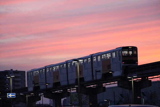 そして、夕焼けマニア、電車(モノレール?)マニアの方にとっては、この光景もトキメクかと。