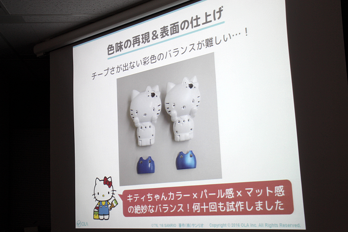 キティちゃんの色味や加工の仕上げ(塗装)、光沢感やマット感の絶妙なバランスを保つまで試作。