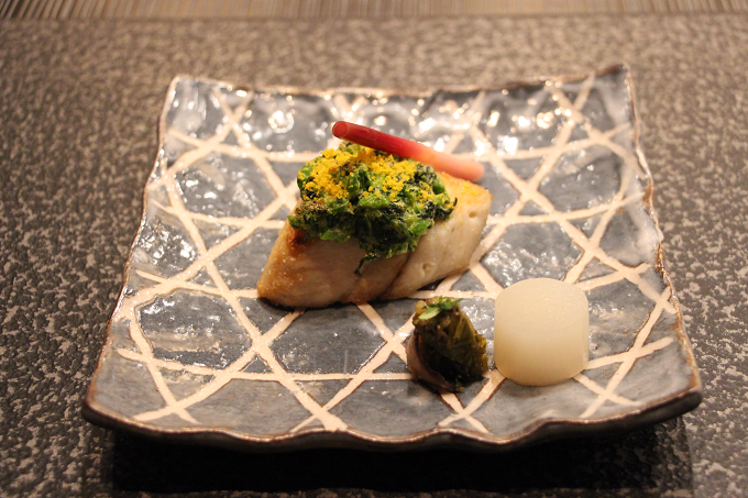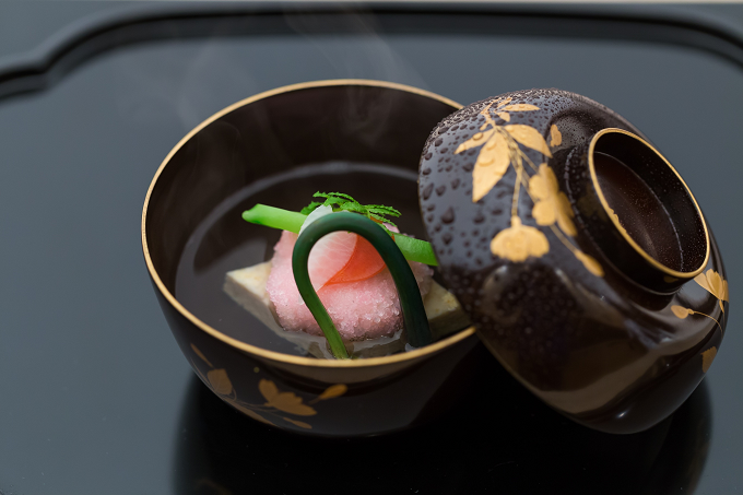 艶やかな料理が続くなかで、立春のお椀「鮎女魚小春仕立て」の優しい口溶けに心ほぐされて。