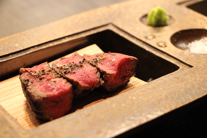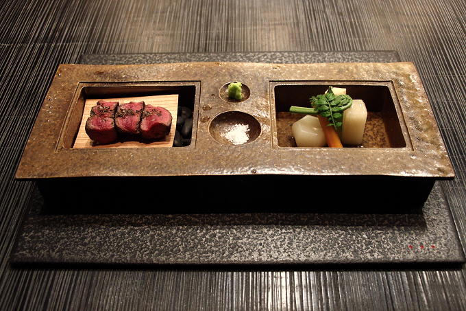 例えば、強肴「牛フィレの炭火焼き」に用いた器もその一つで、左右の空間を独立させながら、温かな料理をずっと食べられるような工夫が凝らされています。