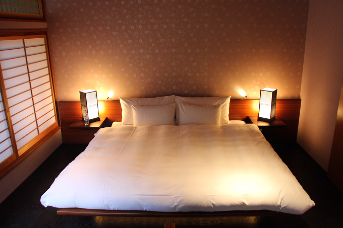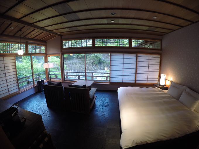 今回は天井が高くモダンなレイアウトが特徴の客室「谷霞 ダブル」を利用。