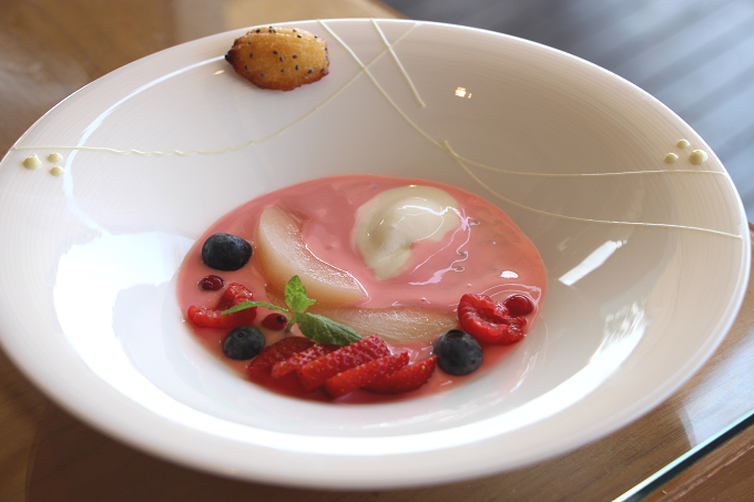 ※「桃とチアシードのプディング フレッシュチーズのシャーベット」