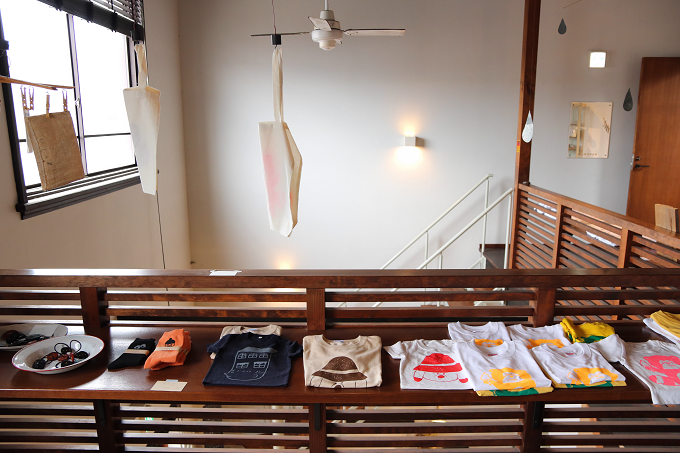 吹き抜け階段をのぼった2階にはギャラリーも存在。伊賀在住のアーティストによるアパレルや文具、小物などの可愛らしいアイテムを販売。