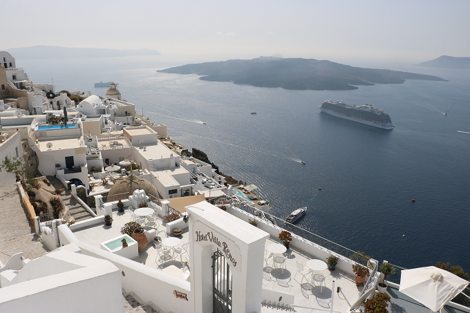 エーゲ海クルーズのなかでも、日本人から人気の高いサントリーニ島。 海底火山噴火を繰り返したことで誕生した三日月形の島は「エーゲ海の真珠」とも呼ばれています。 サントリーニ島の前編として、「テンダーボート」での移動、島の最北端にあるイアの街並みや絶景ワイナリー「サント・ワイン」を紹介。