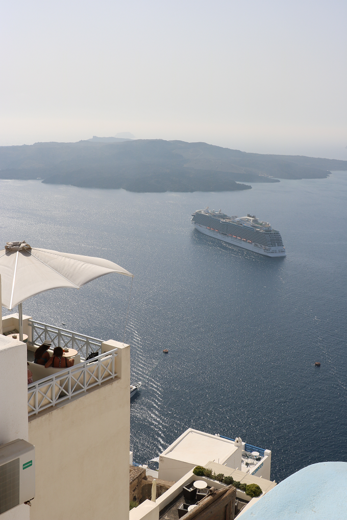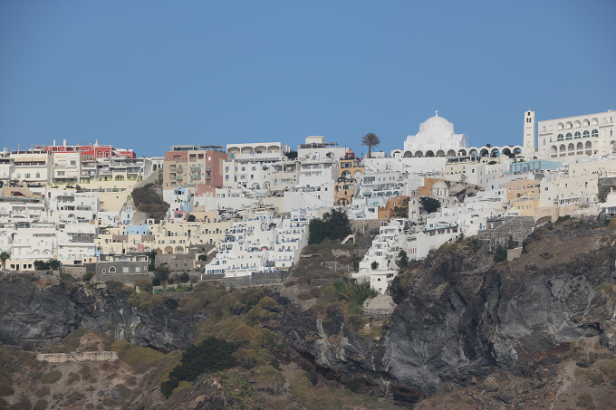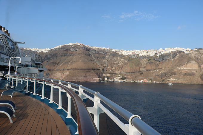 島の見どころを約6.5時間で巡ったサントリーニ島「ショアエクスカーション」の後編記事。 『ロイヤル・プリンセス』から眺める、大規模な火山活動によるカルデラ断崖にも感動! かの有名な伝説アトランティスが海底深くに潜んでいるという説も噂されています。