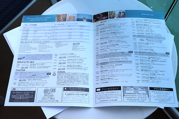 例えば、毎日発行される日本語対応の船内新聞「プリンセス・パター」もその一つ。船内での1日のプログラムやイベントのスケジュール、食事の時間、特別なインフォメーション、夜のドレスコード(服装のアドバイス)など、クルーズ中のアクティビティスケジュールが日本語で掲載されています。