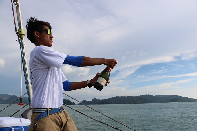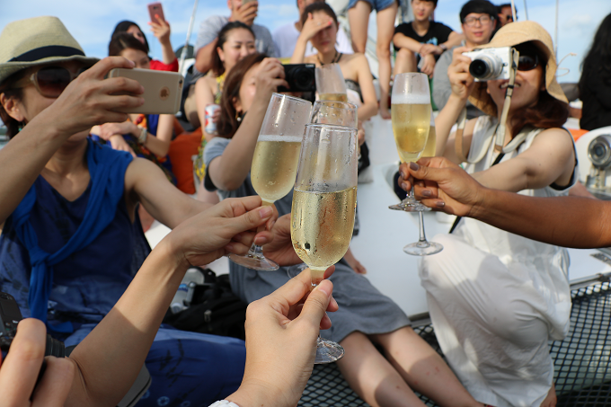 エメラルドグリーンの海と島々を眺めながらの乾杯は最高!