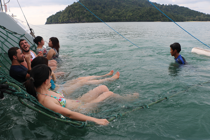クルーズ船の後方に配置された網の中で寛ぐ、いわゆる天然ジャグジーのようなもの。