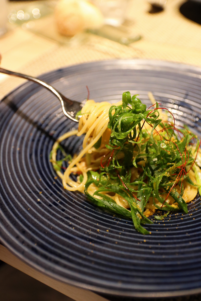 サルデーニャ島のボッタルガスと京野菜、九条ネギのスパゲッティ