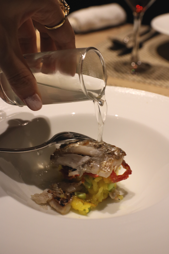 太刀魚の直火焼と、だだちゃ豆の“リゾット・アル・ソルト”~骨からとったクリアーなスープを注いで~