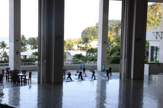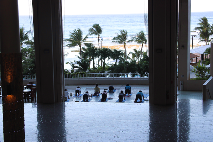 毎朝開催、宿泊者は無料で参加できる朝ヨガ、リラクゼーションを満喫出来る「スパ アユアラン(SPA ayualam)」、タモン湾を見渡せるスイートルームの客室、グアムで一番長いバージンロードのある「大聖堂 クリスタルチャペル」などを紹介。